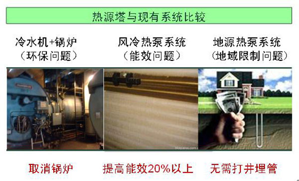 傳統(tǒng)水冷冷水機只能制冷,熱源塔熱泵系統(tǒng)不僅可以制冷制熱,還可制取生活熱水,一機三用。 可以取消鍋爐房,解除安全顧慮,達到節(jié)省機房用地、節(jié)省操作人員、節(jié)省運行費用、減少碳排放的效果。 熱源塔熱泵系統(tǒng)的功能與地源熱泵系統(tǒng)都可一機三用,但是其造價卻比地源熱泵低得多,也不必顧慮地源熱泵系統(tǒng)由于地下?lián)Q熱器的計算問題或是施工質量問題所引起的失敗風險。